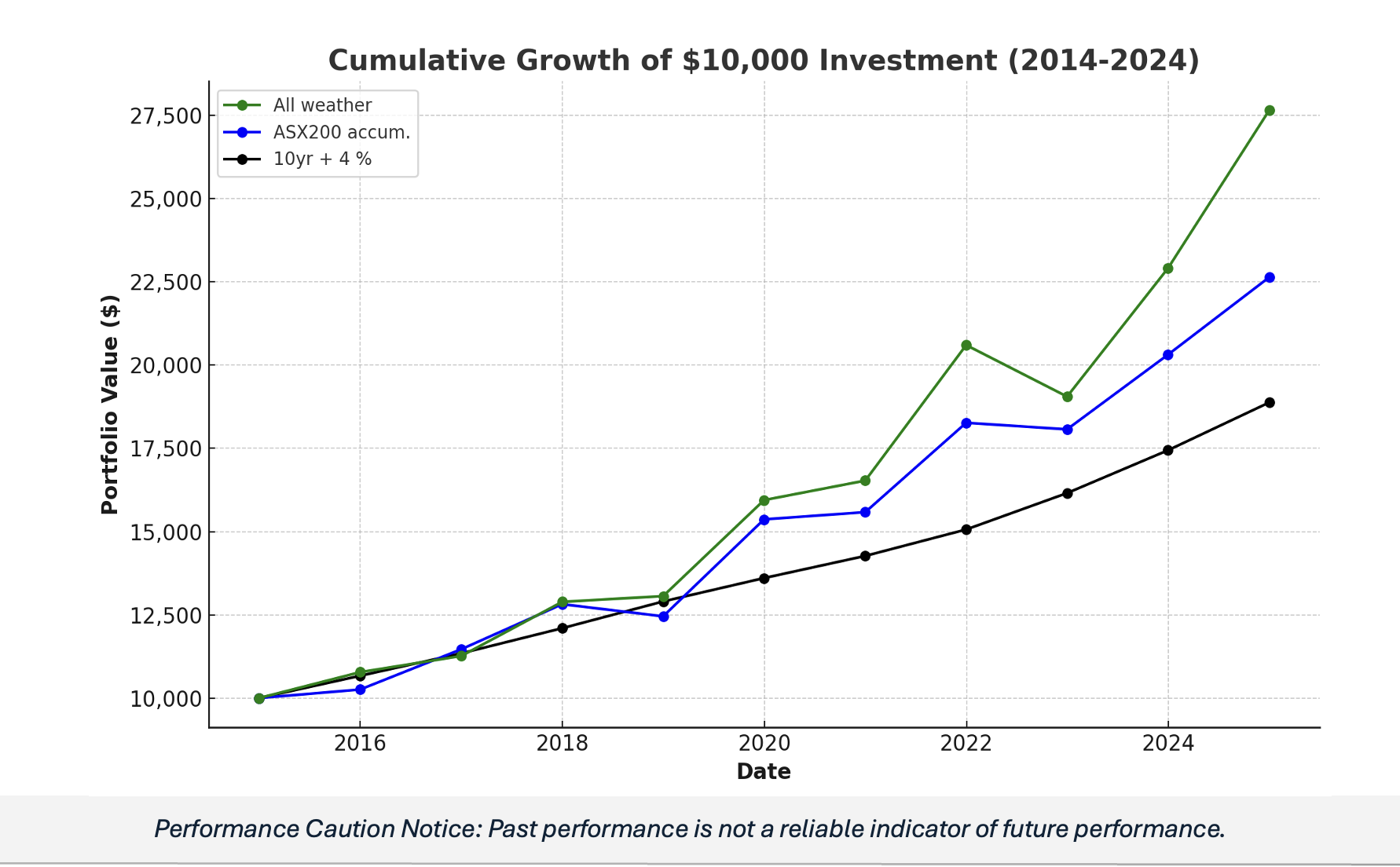 The portfolio seeks to outperform the 10- year Australian government bond plus 4% over the long term. Since inception in December 2014 the fund has consistently outperformed the benchmark index over a rolling 3 year average.